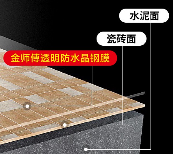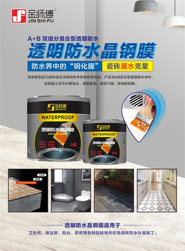金師傅透明防水晶鋼膜是一款透明隱形防水,不影響美觀,還防滑易擦洗,解決普通防水膠時(shí)間長(zhǎng)發(fā)黃、施工后遇水起皮脫殼、施工不凝固等問(wèn)題。